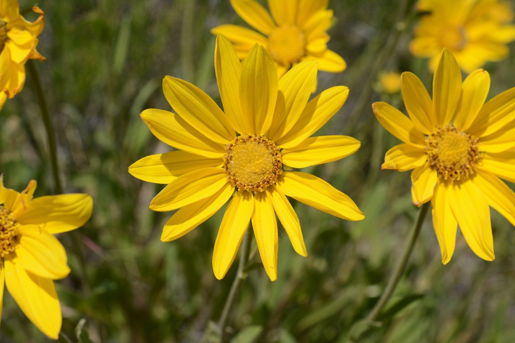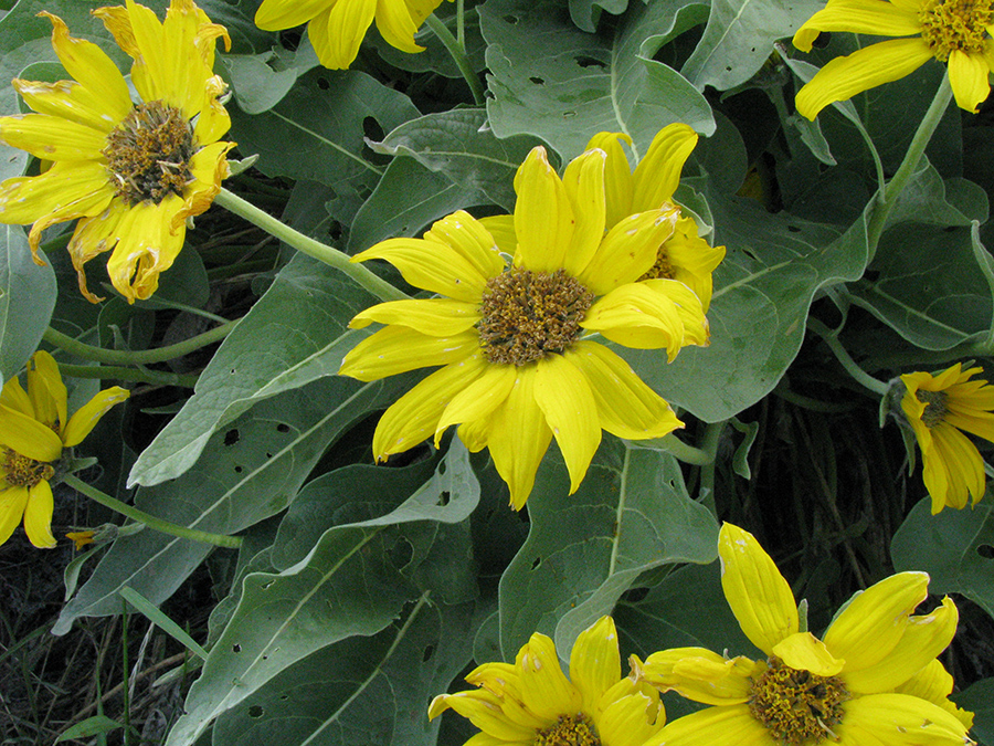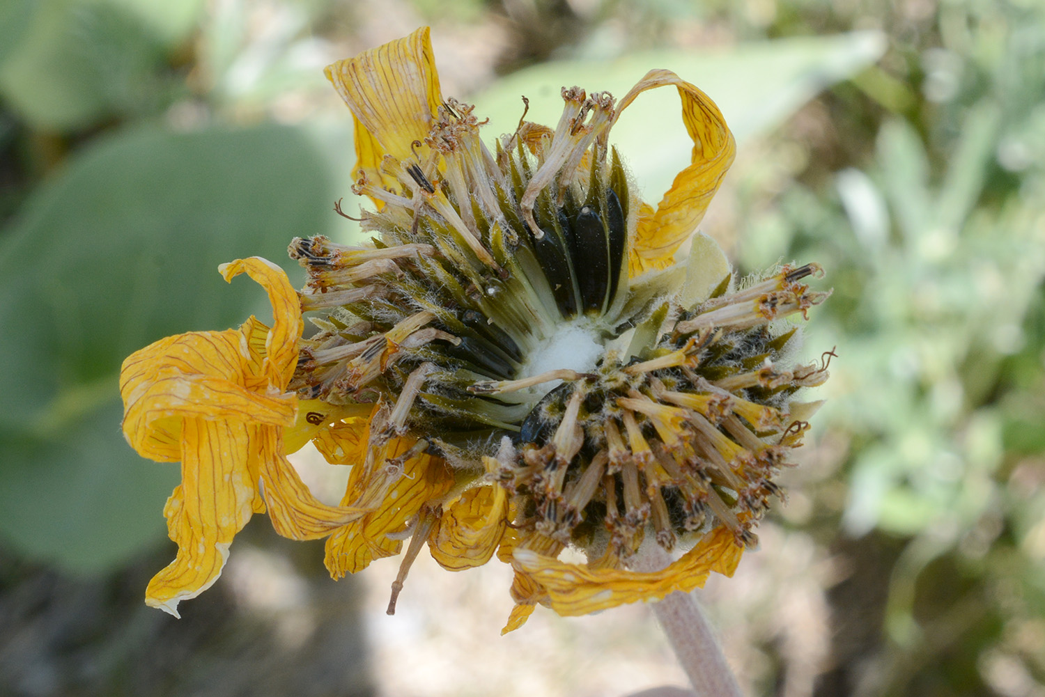 Other cypselas nestle deep inside stiff, sharp paleae as seen in Arrowleaf Balsamroots – Balsamorhiza sagittata. Look closely in the center and you will see the squarish-shaped tops of the cypselas. The sharp dividers are the paleae.