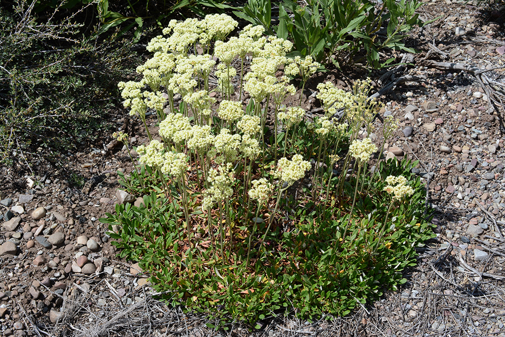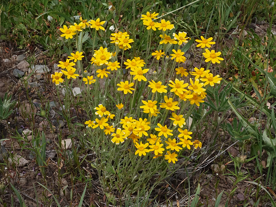 Growing amidst mountain sagebrush and rabbitbushes in dry habitats, 1-2′ shrubs of Spineless Horsebrush – Tetradymia canescens – stand out at this time of year. They have silvery pubescent stems and leaves topped by plumose heads of