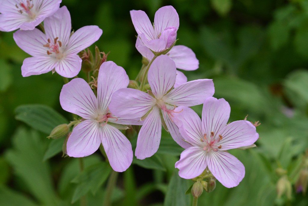 Sticky geranium – Geranium viscossissimum – flowers each produce a total 5 or more seeds, usually 1-2 nestled in each of 5 separate compartments of the ovary at the base of the pistil. When the ovary begins to dry, tension builds up, the style splits apart, curls, and literally catapults the seeds several feet beyond.